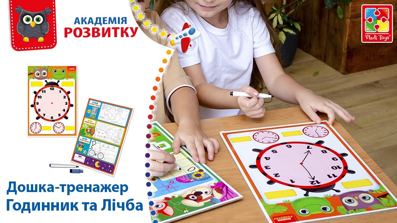 На одній стороні дошки зображений годинник, на який дитина повинна домальовувати маркером стрілки. У разі помилки маркер легко стирається за допомогою губки. На другому боці розписано порядок дня з картинками, які потрібно обвести за контуром. Під час гри дитина тренує логіку, пам’ять і розвиває дрібну моторику.